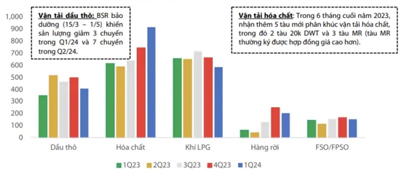 Đối với mảng vận tải dầu thô, sản lượng vận chuyển nội địa trong quý 1/2024 đã giảm xuống khoảng 3 chuyến do Nhà máy Lọc dầu Dung Quất bảo dưỡng (từ 15/3 - 1/5). Tuy nhiên, giá thuê tàu trong quý đã tăng 10%, giúp doanh thu vận tải dầu thô của PV Trans vẫn tăng 17% so với cùng kỳ năm trước, đạt 406 tỷ đồng, đóng góp 16% tổng doanh thu.